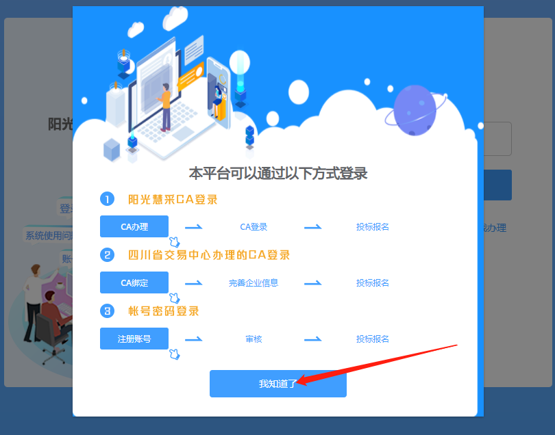 浏览器输入 https://www.ezb.net.cn/ 进入阳光慧采,点击供应商入口(注册账号建议使用:Google浏览器(点击下载)或360浏览器极速模式),点击【我知道了】。